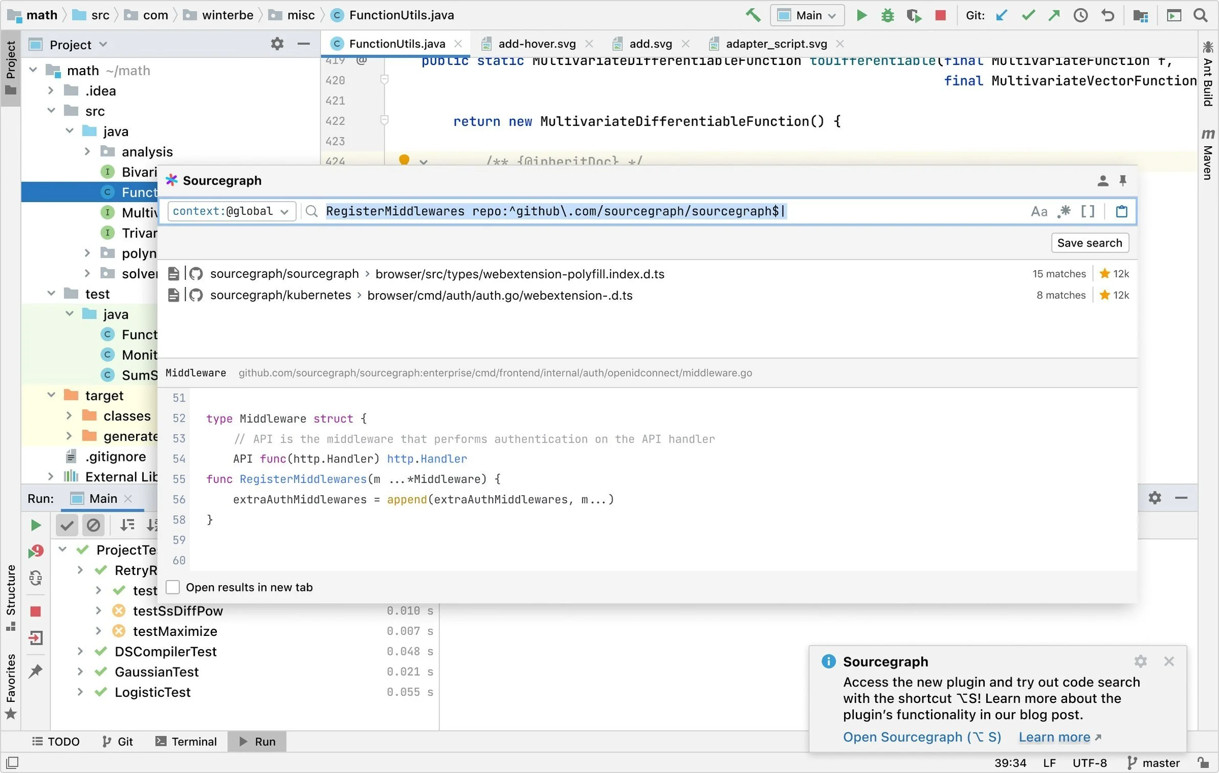 Our first release of the JetBrains extension mirrored their native search by housing the search input and results in a modal. We modified the syntax and visual design of how our search results were displayed to be more closely aligned to JetBrains. I leveraged key iconography from Sourcegraph to denote the different result types (commits, diffs, repositories, file paths), while modifying the syntax to be more familiar to a JetBrains user.